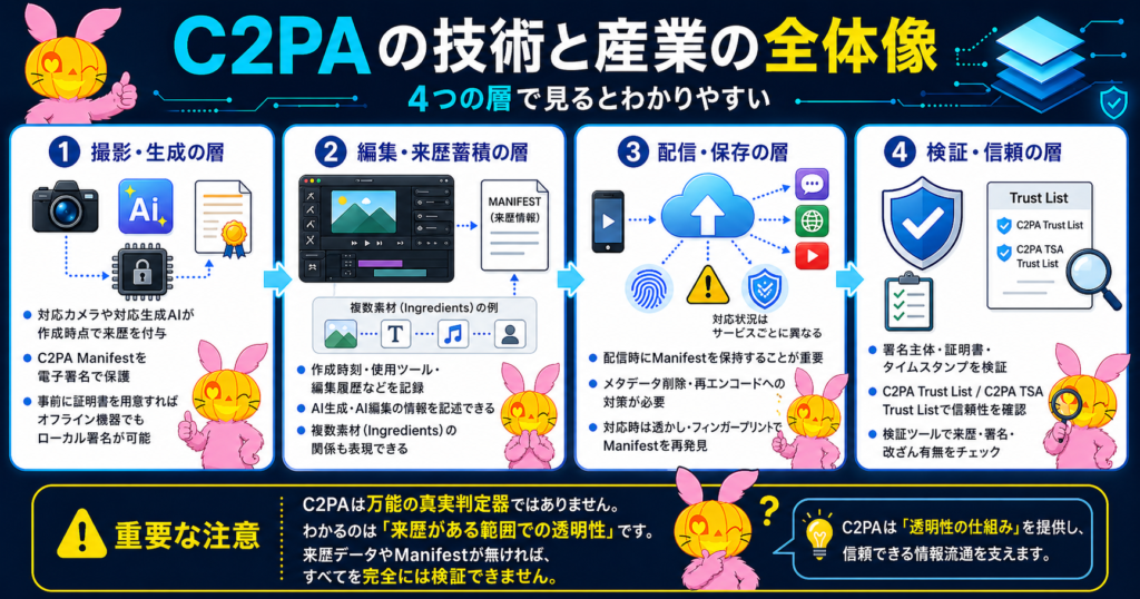 C2PAを理解するときは、四つの層に分けると分かりやすくなります。